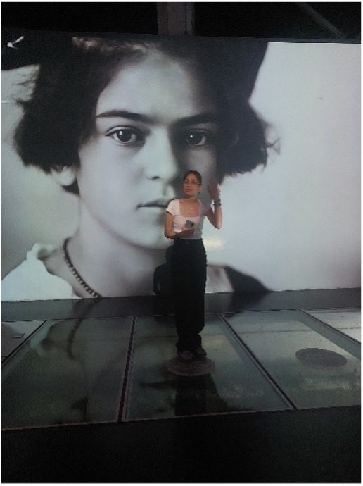 Serginin rehberi ve aynı zamanda Sanat Tarihçi Buse Aksoy’un (alt resim) faaliyet öncesi verdiği Kahlo hakkındaki bilgilerle içeriye adım attığınız andan itibaren o büyülü atmosferle buluşuyorsunuz.  Hareketlendirilmiş tablolar, makasların, çivilerin, kanın ve rahim imgelerinin havada dans edişi Frida’nın zihnine açılmış bir pencere gibi. Anlatılması kolay değil, seyirci olmaktan öteye geçemiyorsunuz.