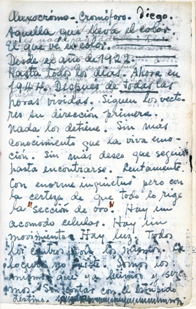 Her zaman ve sonsuza kadar. Şimdi 1944’te. Yaşanan tüm saatlerden sonra. Vektörler orijinal yönlerinde devam ediyor. Hiçbir şey onları durduramaz. Canlı duygudan daha fazla bilgi olmadan. Karşılaşana kadar devam etmekten başka bir istek olmadan. Yavaşça. Büyük bir huzursuzlukla, ancak her şeyin “altın oran” tarafından yönlendirildiği kesinliğiyle. Hücresel düzenleme var. Hareket var. Işık var. Tüm merkezler aynı. Delilik diye bir şey yok. Bizler olduğumuz ve olacağımız gibiyiz. Aptalca kadere güvenmiyoruz.”