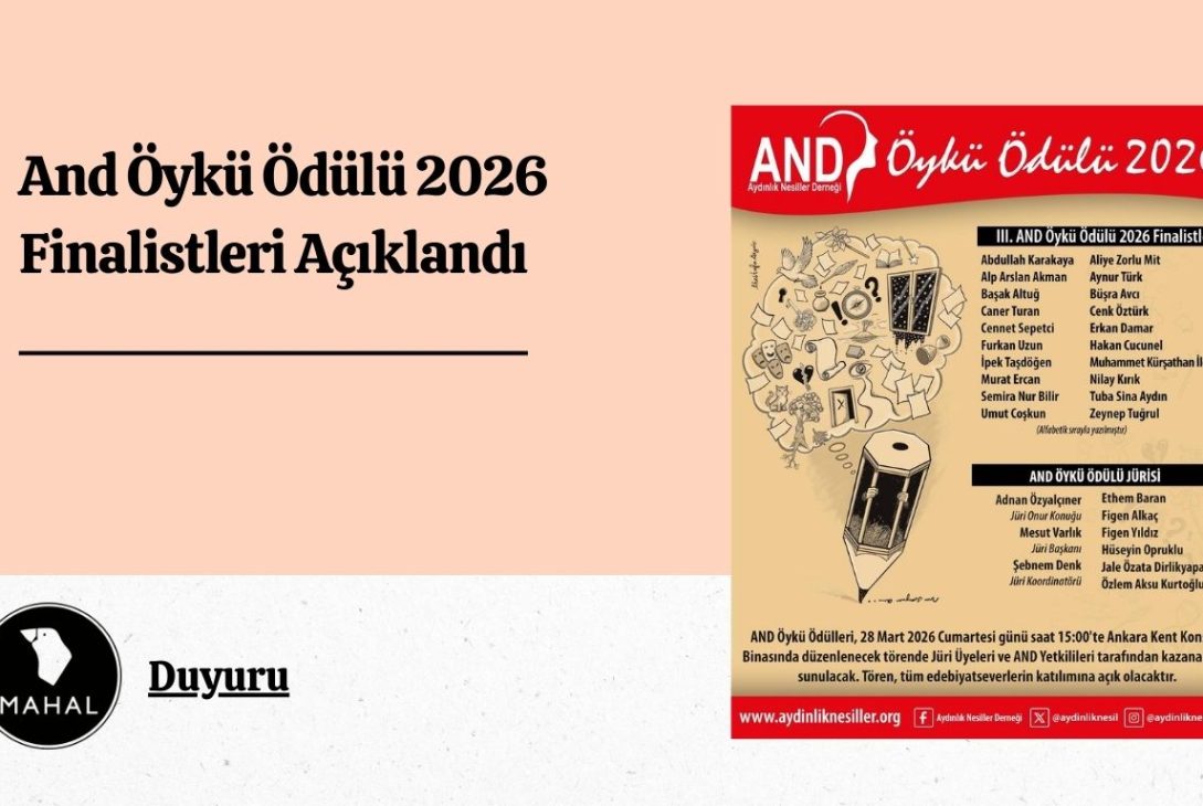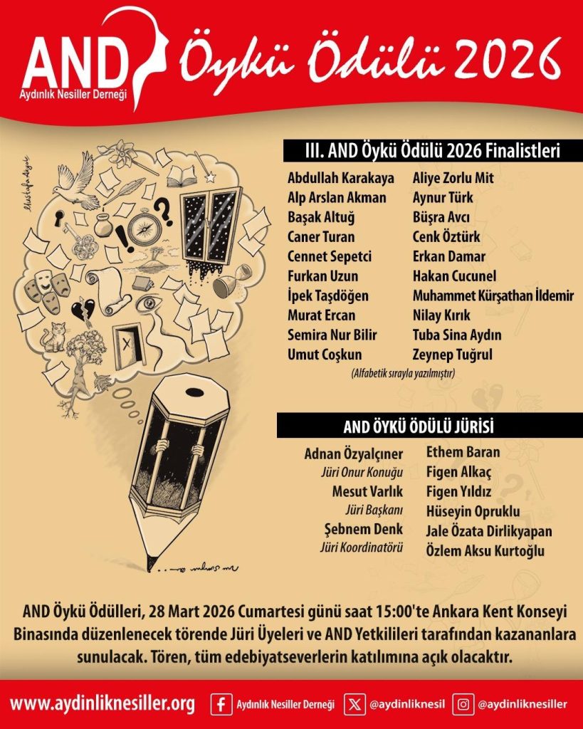 AND Öykü Ödülü’nün üçüncü yılında, onur konuğunun edebiyatımızın çınarlarından Adnan Özyalçıner, Jüri Başkanının Mesut Varlık, Jüri Üyelerinin Ethem Baran, Figen Alkaç, Jale Özata Dirlikyapan, Figen Yıldız, Hüseyin Opruklu, Özlem Aksu Kurtoğlu’nun olduğu ve koordinasyonunu Şebnem Denk’in yaptığı AND Öykü Ödülleri, 28 Mart 2026 Cumartesi günü saat 15:00’te Ankara Kent Konseyi Binasında düzenlenecek törende Jüri Üyeleri ve AND Yetkilileri tarafından kazananlara sunulacaktır.